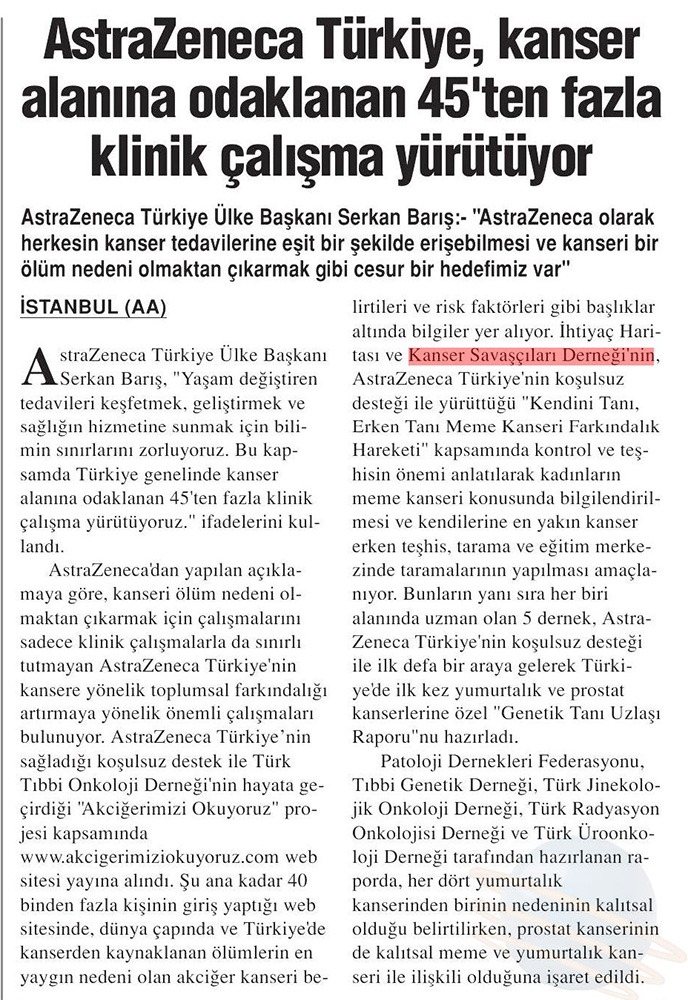 ASTRAZENECA TÜRKİYE, KANSER ALANINA ODAKLANAN 45'TEN FAZLA KLİNİK ÇALIŞMA YÜRÜTÜYOR